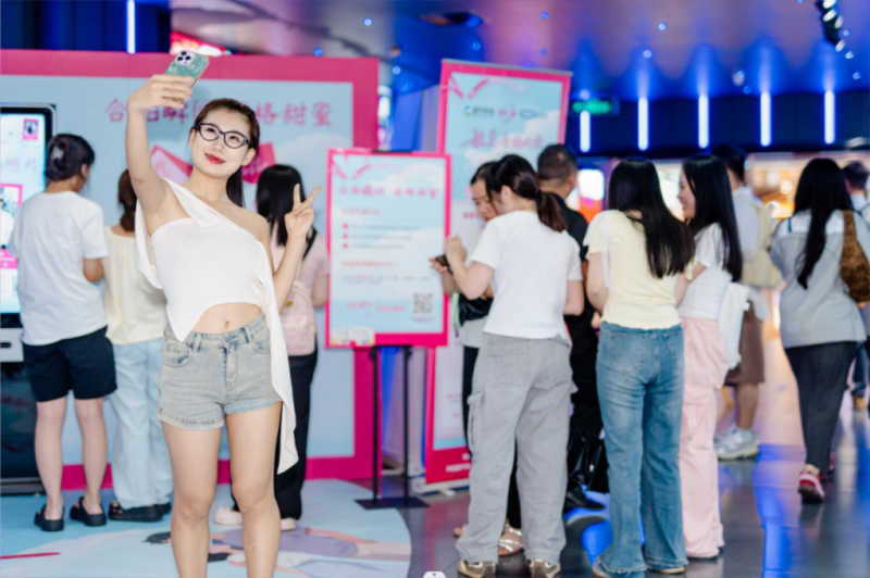 在影城主活动区,温馨有趣的互动装置吸引了众多参与者。体验者可以使用毓婷七夕海报配方生成专属图片,通过现场美图秀秀定制的打印装置,将数字化的甜蜜瞬间定格为持久印记。科技也为浪漫赋能,活动现场特别设置了音乐感应区,参与者只需启用手机NFC功能轻触感应胶片,即可聆听专属的“合拍旋律”,在悠扬的乐曲中感知与身边人的频率共鸣。完成互动体验后,大家还能收获品牌精心准备的七夕定制好礼。